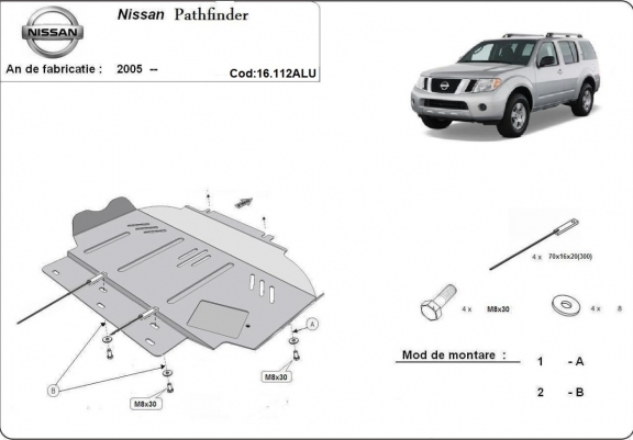Der Unterfahrschutz ist neu und passt perfekt für alle Nissan Pathfinder versionen, die zwischen 2005 und 2026 hergestellt wurden. Die Abschirmung schützt: motor Aus Aluminiumblech angefertigt mit einer Stärke von 4 mm. Die Schilde bestehen aus Aluminium, aber die Befestigungshalterungen bestehen aus Stahl. Schrauben, Mutter, Klips - alle Befestigungszubehör sind im Lieferung enthalten. Um mehr Schutz zu bieten gegen Korrosion wird der Unterfahrschutz elektrostatisch besprüht (Pulverbeschichtet) und bei 200o eingebrannt bzw. getrocknet. |