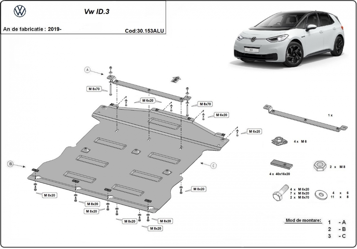 Der Unterfahrschutz ist neu und passt perfekt für alle Volkswagen ID.3 versionen, die zwischen 2019 und 2026 hergestellt wurden. Die Abschirmung schützt: motor, getriebe, kühler Aus Aluminiumblech angefertigt mit einer Stärke von 3 mm. Die Schilde bestehen aus Aluminium, aber die Befestigungshalterungen bestehen aus Stahl. Schrauben, Mutter, Klips - alle Befestigungszubehör sind im Lieferung enthalten. Um mehr Schutz zu bieten gegen Korrosion wird der Unterfahrschutz elektrostatisch besprüht (Pulverbeschichtet) und bei 200o eingebrannt bzw. getrocknet. |
