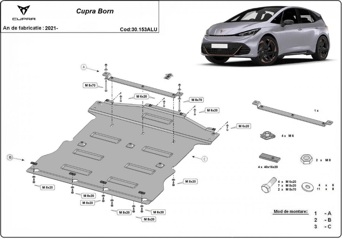 Der Unterfahrschutz ist neu und passt perfekt für alle Cupra Born versionen, die zwischen 2021 und 2026 hergestellt wurden. Die Abschirmung schützt: motor, getriebe, kühler Aus Aluminiumblech angefertigt mit einer Stärke von 3 mm. Die Schilde bestehen aus Aluminium, aber die Befestigungshalterungen bestehen aus Stahl. Schrauben, Mutter, Klips - alle Befestigungszubehör sind im Lieferung enthalten. Um mehr Schutz zu bieten gegen Korrosion wird der Unterfahrschutz elektrostatisch besprüht (Pulverbeschichtet) und bei 200o eingebrannt bzw. getrocknet. |