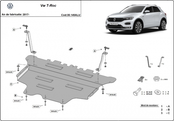 Der Unterfahrschutz ist neu und passt perfekt für alle Volkswagen T-Roc versionen, die zwischen 2017 und 2026 hergestellt wurden. Die Abschirmung schützt: motor, getriebe, kühler, vordere stossfänger Aus Aluminiumblech angefertigt mit einer Stärke von 3 mm. Die Schilde bestehen aus Aluminium, aber die Befestigungshalterungen bestehen aus Stahl. Schrauben, Mutter, Klips - alle Befestigungszubehör sind im Lieferung enthalten. Um mehr Schutz zu bieten gegen Korrosion wird der Unterfahrschutz elektrostatisch besprüht (Pulverbeschichtet) und bei 200o eingebrannt bzw. getrocknet. |