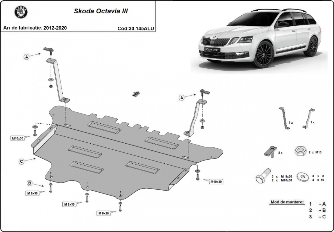 Der Unterfahrschutz ist neu und passt perfekt für alle Skoda Octavia 3 versionen, die zwischen 2012 und 2020 hergestellt wurden. Die Abschirmung schützt: motor, getriebe, kühler, vordere stossfänger Aus Aluminiumblech angefertigt mit einer Stärke von 3 mm. Die Schilde bestehen aus Aluminium, aber die Befestigungshalterungen bestehen aus Stahl. Schrauben, Mutter, Klips - alle Befestigungszubehör sind im Lieferung enthalten. Um mehr Schutz zu bieten gegen Korrosion wird der Unterfahrschutz elektrostatisch besprüht (Pulverbeschichtet) und bei 200o eingebrannt bzw. getrocknet. |