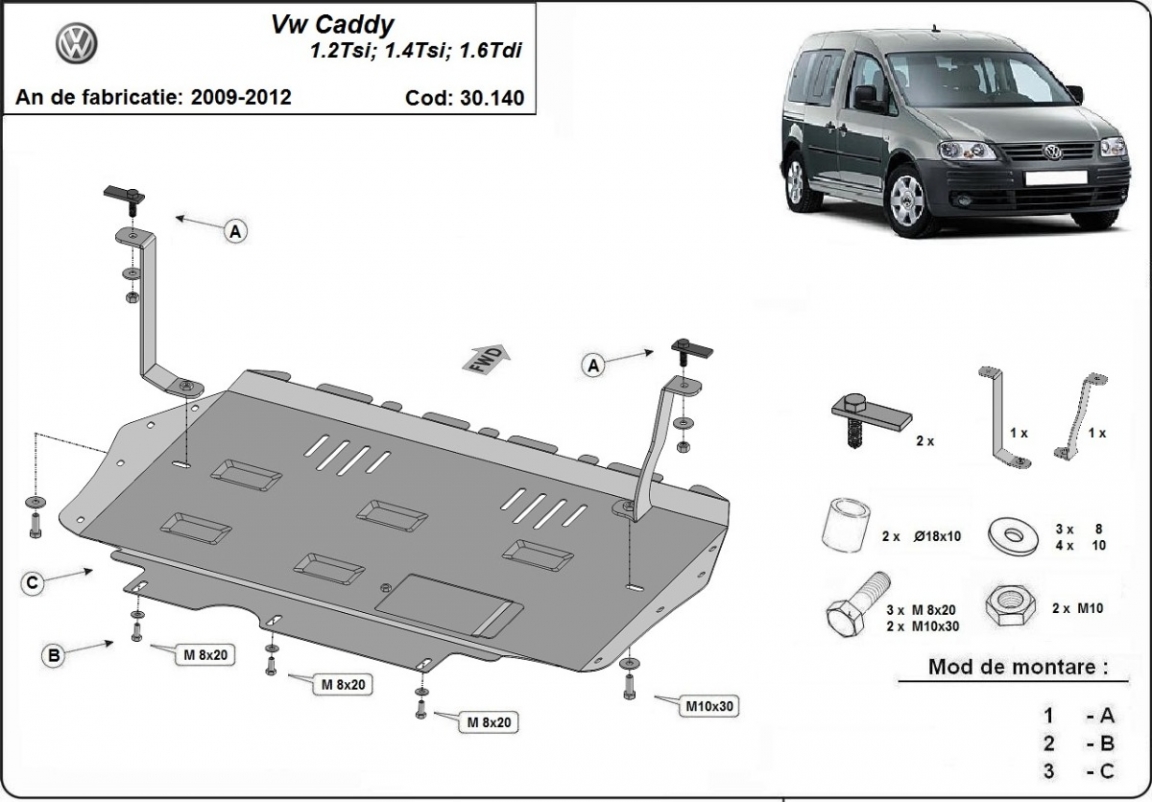 Der Unterfahrschutz ist neu und passt perfekt für den Volkswagen Caddy mit den folgenden Motor- / Antriebsversionen: 1.2,1.4,TSI, 1.6TDI, - hergestellt zwischen 2010 und 2012. Die Abschirmung schützt: motor, getriebe, kühler Befügt über ein Fensterchen zur Ölwanne, so dass dessen Entfernung beim Ölwechsel nicht notwendig sein wird. Aus Stahlblech angefertigt mit einer Stärke von 2 mm. Schrauben, Mutter, Klips - alle Befestigungszubehör sind im Lieferung enthalten. Um mehr Schutz zu bieten gegen Korrosion wird der Unterfahrschutz elektrostatisch besprüht (Pulverbeschichtet) und bei 200o eingebrannt bzw. getrocknet. |