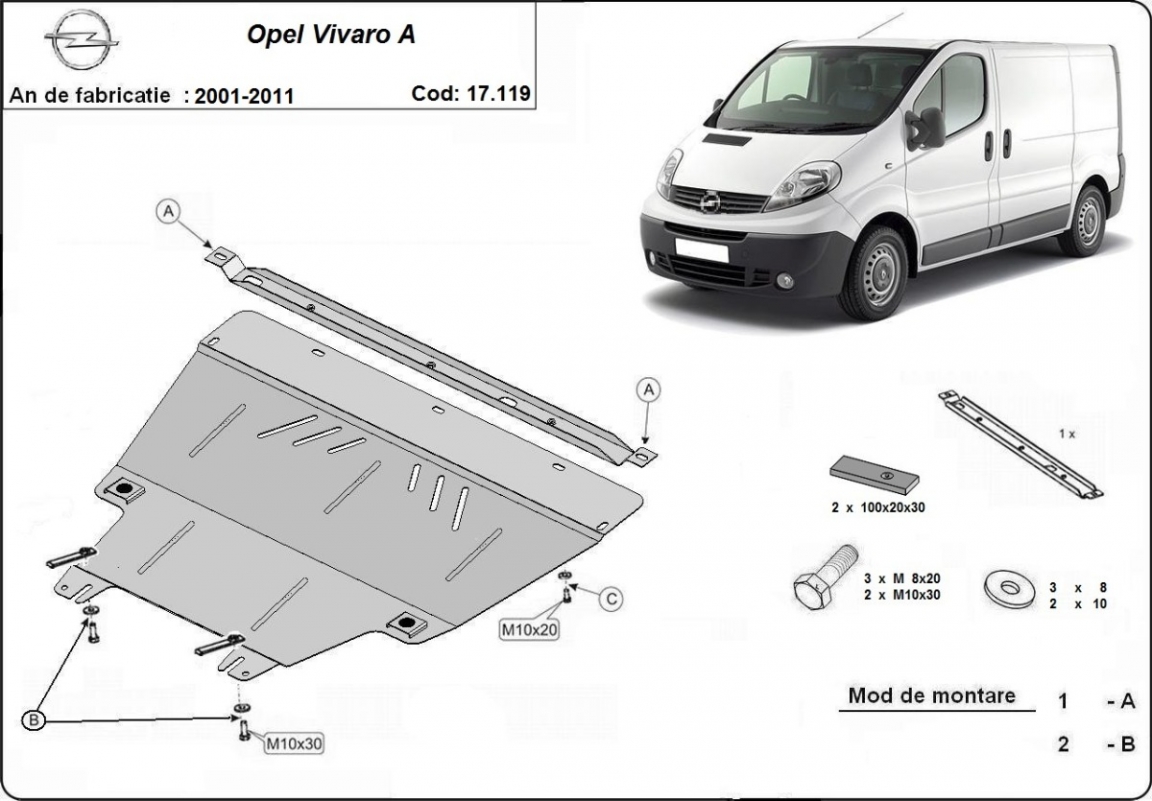 Der Unterfahrschutz ist neu und passt perfekt für alle Opel Vivaro versionen, die zwischen 2001 und 2011 hergestellt wurden. Die Abschirmung schützt: motor, getriebe, kühler Aus Stahlblech angefertigt mit einer Stärke von 2 mm. Schrauben, Mutter, Klips - alle Befestigungszubehör sind im Lieferung enthalten. Um mehr Schutz zu bieten gegen Korrosion wird der Unterfahrschutz elektrostatisch besprüht (Pulverbeschichtet) und bei 200o eingebrannt bzw. getrocknet. |
