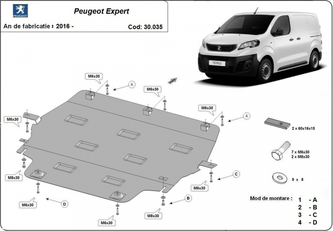 Der Unterfahrschutz ist neu und passt perfekt für alle Peugeot Expert versionen, die zwischen 2016 und 2026 hergestellt wurden. Die Abschirmung schützt: motor, getriebe, kühler Aus Stahlblech angefertigt mit einer Stärke von 2 mm. Schrauben, Mutter, Klips - alle Befestigungszubehör sind im Lieferung enthalten. Um mehr Schutz zu bieten gegen Korrosion wird der Unterfahrschutz elektrostatisch besprüht (Pulverbeschichtet) und bei 200o eingebrannt bzw. getrocknet. |