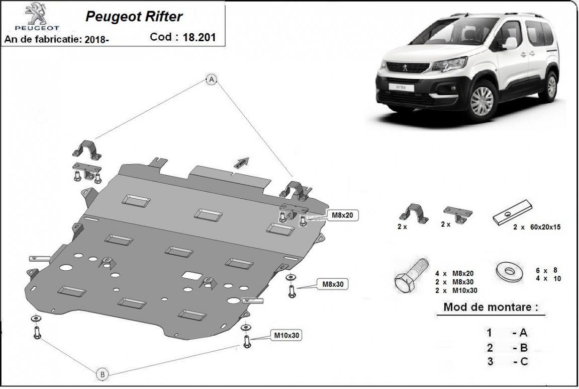 Der Unterfahrschutz ist neu und passt perfekt für alle Peugeot Rifter versionen, die zwischen 2018 und 2026 hergestellt wurden. Die Abschirmung schützt: motor, getriebe, kühler, vordere stossfänger Aus Stahlblech angefertigt mit einer Stärke von 2 mm. Schrauben, Mutter, Klips - alle Befestigungszubehör sind im Lieferung enthalten. Um mehr Schutz zu bieten gegen Korrosion wird der Unterfahrschutz elektrostatisch besprüht (Pulverbeschichtet) und bei 200o eingebrannt bzw. getrocknet. |