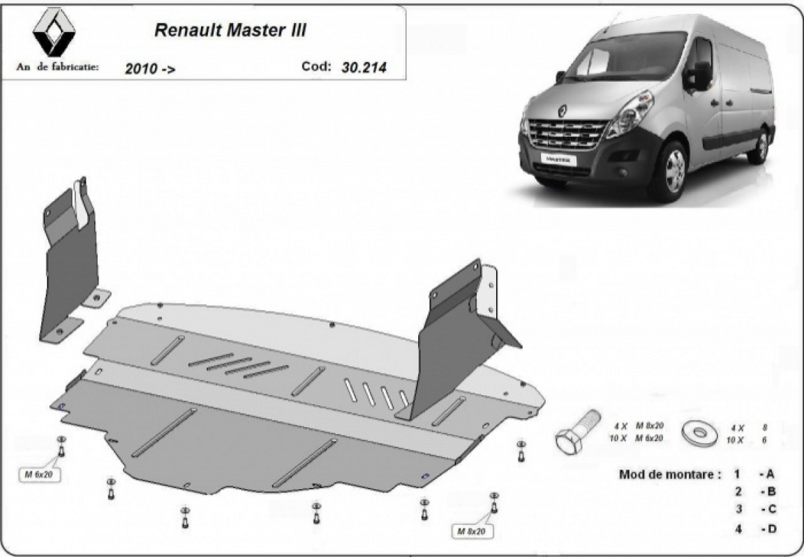 Der Unterfahrschutz ist neu und passt perfekt für alle Renault Master 3 versionen, die zwischen 2010 und 2024 hergestellt wurden. Die Abschirmung schützt: motor, getriebe, kühler, vordere stossfänger Aus Stahlblech angefertigt mit einer Stärke von 2 mm. Schrauben, Mutter, Klips - alle Befestigungszubehör sind im Lieferung enthalten. Um mehr Schutz zu bieten gegen Korrosion wird der Unterfahrschutz elektrostatisch besprüht (Pulverbeschichtet) und bei 200o eingebrannt bzw. getrocknet. |