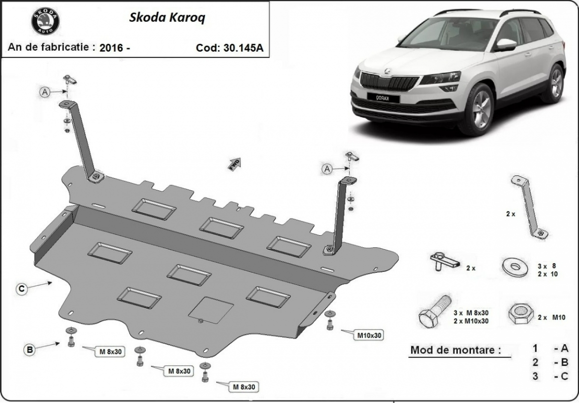 Der Unterfahrschutz ist neu und passt perfekt für alle Skoda Karoq versionen, die zwischen 2017 und 2026 hergestellt wurden. Die Abschirmung schützt: motor, getriebe, kühler, vordere stossfänger Befügt über ein Fensterchen zur Ölwanne, so dass dessen Entfernung beim Ölwechsel nicht notwendig sein wird. Aus Stahlblech angefertigt mit einer Stärke von 2 mm. Schrauben, Mutter, Klips - alle Befestigungszubehör sind im Lieferung enthalten. Um mehr Schutz zu bieten gegen Korrosion wird der Unterfahrschutz elektrostatisch besprüht (Pulverbeschichtet) und bei 200o eingebrannt bzw. getrocknet. |