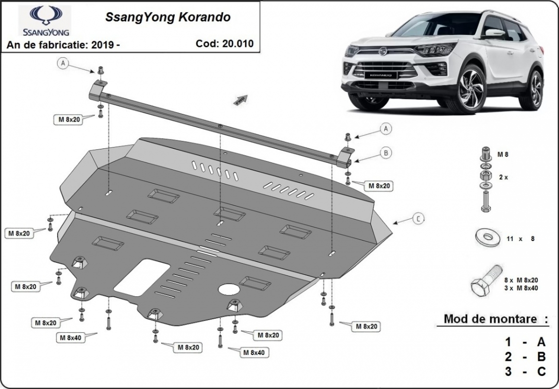 Der Unterfahrschutz ist neu und passt perfekt für alle SsangYong Korando versionen, die zwischen 2019 und 2026 hergestellt wurden. Die Abschirmung schützt: motor, getriebe, kühler Aus Stahlblech angefertigt mit einer Stärke von 2 mm. Schrauben, Mutter, Klips - alle Befestigungszubehör sind im Lieferung enthalten. Um mehr Schutz zu bieten gegen Korrosion wird der Unterfahrschutz elektrostatisch besprüht (Pulverbeschichtet) und bei 200o eingebrannt bzw. getrocknet. |