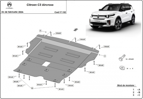 Der Unterfahrschutz ist neu und passt perfekt für alle Citroen C3 Aircross versionen, die zwischen 2024 und 2026 hergestellt wurden. Die Abschirmung schützt: motor, getriebe Aus Stahlblech angefertigt mit einer Stärke von 2 mm. Schrauben, Mutter, Klips - alle Befestigungszubehör sind im Lieferung enthalten. Um mehr Schutz zu bieten gegen Korrosion wird der Unterfahrschutz elektrostatisch besprüht (Pulverbeschichtet) und bei 200o eingebrannt bzw. getrocknet. |