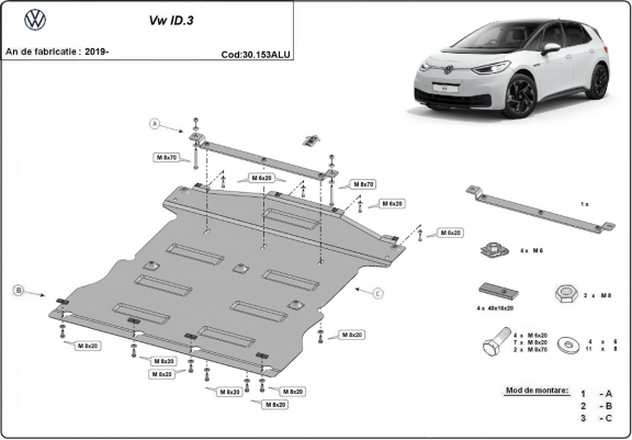 Der Unterfahrschutz ist neu und passt perfekt für alle Volkswagen ID.3 versionen, die zwischen 2019 und 2026 hergestellt wurden. Die Abschirmung schützt: motor, getriebe, kühler Aus Aluminiumblech angefertigt mit einer Stärke von 3 mm. Die Schilde bestehen aus Aluminium, aber die Befestigungshalterungen bestehen aus Stahl. Schrauben, Mutter, Klips - alle Befestigungszubehör sind im Lieferung enthalten. Um mehr Schutz zu bieten gegen Korrosion wird der Unterfahrschutz elektrostatisch besprüht (Pulverbeschichtet) und bei 200o eingebrannt bzw. getrocknet. |