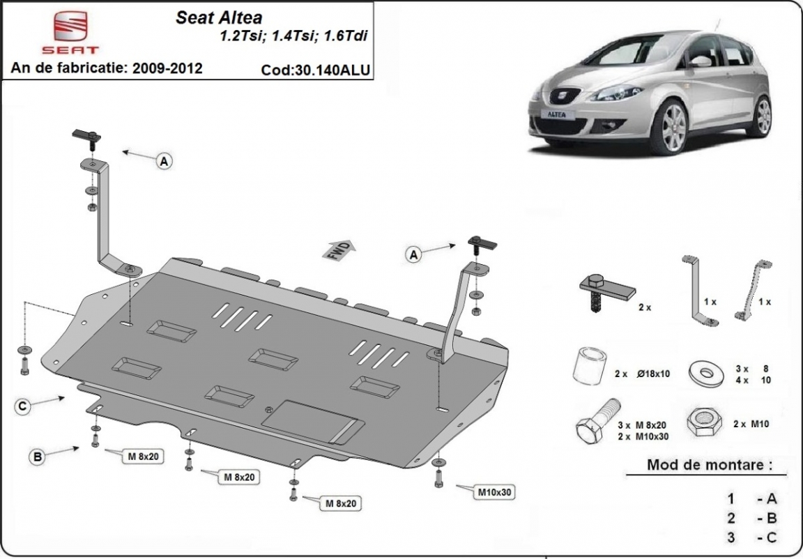 Aluminium Unterfahrschutz für Motor und Getriebe aus Stahl für den Seat Altea (2009-2012)