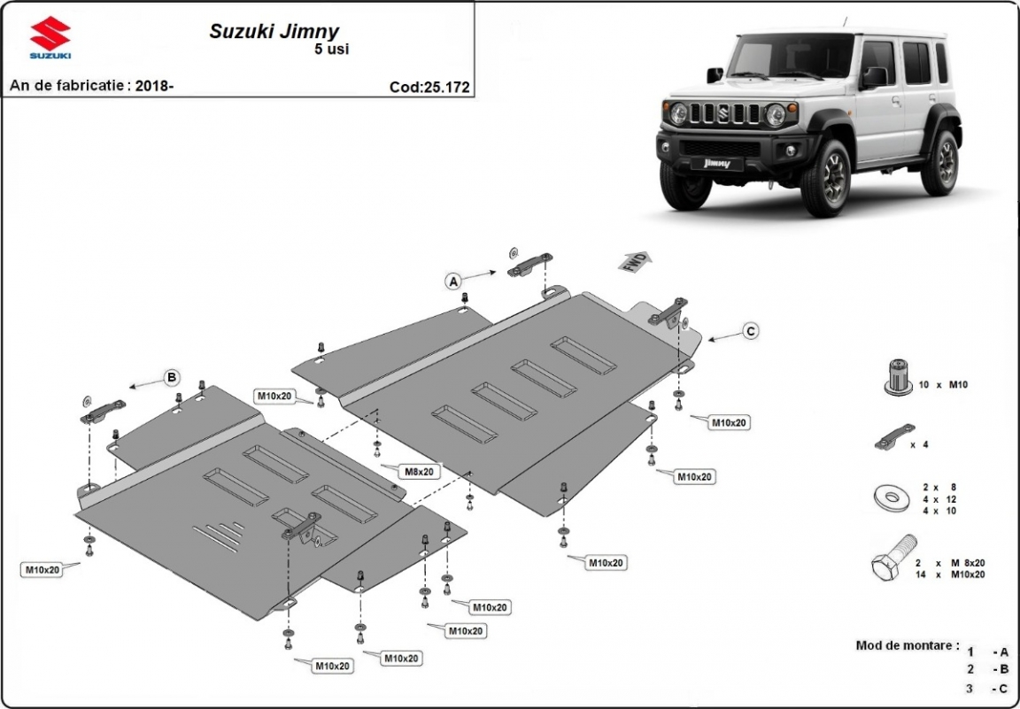 Der Unterfahrschutz ist neu und passt perfekt für alle Suzuki Jimny versionen, die zwischen 2018 und 2026 hergestellt wurden. Die Abschirmung schützt: getriebe, Verteilergetriebe Aus Stahlblech angefertigt mit einer Stärke von 2.5 mm. Schrauben, Mutter, Klips - alle Befestigungszubehör sind im Lieferung enthalten. Um mehr Schutz zu bieten gegen Korrosion wird der Unterfahrschutz elektrostatisch besprüht (Pulverbeschichtet) und bei 200o eingebrannt bzw. getrocknet. |