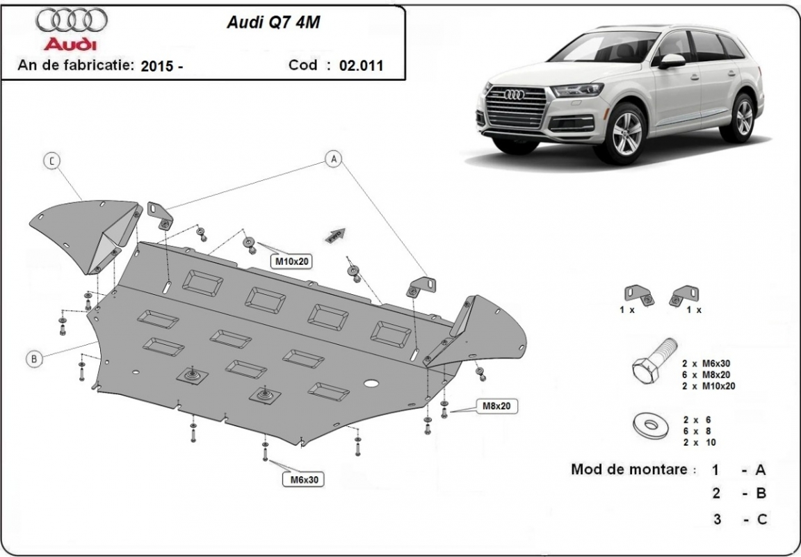 Der Unterfahrschutz ist neu und passt perfekt für alle Audi Q7 versionen, die zwischen 2015 und 2026 hergestellt wurden. Die Abschirmung schützt: motor, kühler, vordere stossfänger Aus Stahlblech angefertigt mit einer Stärke von 2 mm. Schrauben, Mutter, Klips - alle Befestigungszubehör sind im Lieferung enthalten. Um mehr Schutz zu bieten gegen Korrosion wird der Unterfahrschutz elektrostatisch besprüht (Pulverbeschichtet) und bei 200o eingebrannt bzw. getrocknet. |