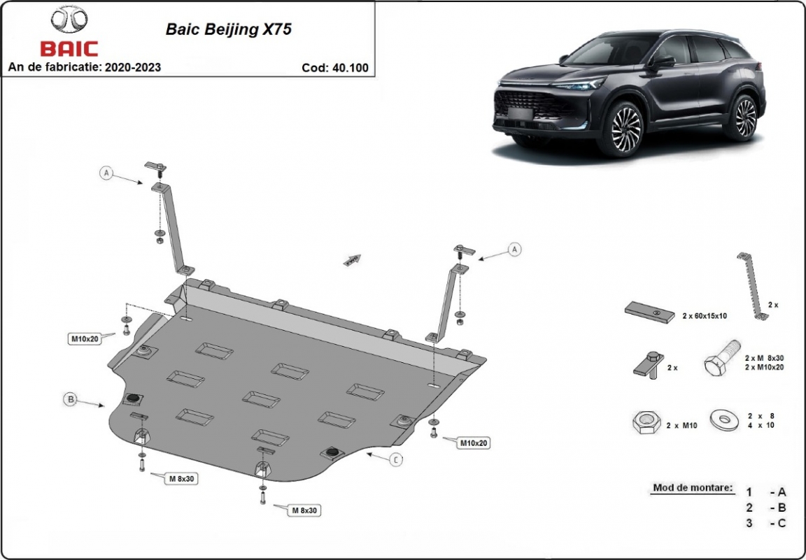 Der Unterfahrschutz ist neu und passt perfekt für alle Baic Beijing X75 versionen, die zwischen 2020 und 2023 hergestellt wurden. Die Abschirmung schützt: motor, getriebe, kühler Aus Stahlblech angefertigt mit einer Stärke von 2 mm. Schrauben, Mutter, Klips - alle Befestigungszubehör sind im Lieferung enthalten. Um mehr Schutz zu bieten gegen Korrosion wird der Unterfahrschutz elektrostatisch besprüht (Pulverbeschichtet) und bei 200o eingebrannt bzw. getrocknet. |