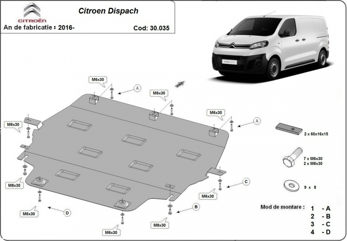 Der Unterfahrschutz ist neu und passt perfekt für den Citroen Dispatch mit den folgenden Motor- / Antriebsversionen: toTE - hergestellt zwischen 2016 und 2026. Die Abschirmung schützt: motor, getriebe, kühler Aus Stahlblech angefertigt mit einer Stärke von 2 mm. Schrauben, Mutter, Klips - alle Befestigungszubehör sind im Lieferung enthalten. Um mehr Schutz zu bieten gegen Korrosion wird der Unterfahrschutz elektrostatisch besprüht (Pulverbeschichtet) und bei 200o eingebrannt bzw. getrocknet. |