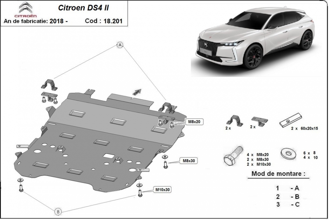 Der Unterfahrschutz ist neu und passt perfekt für alle Citroen DS4 versionen, die zwischen 2021 und 2026 hergestellt wurden. Die Abschirmung schützt: motor, getriebe, kühler, vordere stossfänger Aus Stahlblech angefertigt mit einer Stärke von 2 mm. Schrauben, Mutter, Klips - alle Befestigungszubehör sind im Lieferung enthalten. Um mehr Schutz zu bieten gegen Korrosion wird der Unterfahrschutz elektrostatisch besprüht (Pulverbeschichtet) und bei 200o eingebrannt bzw. getrocknet. |
