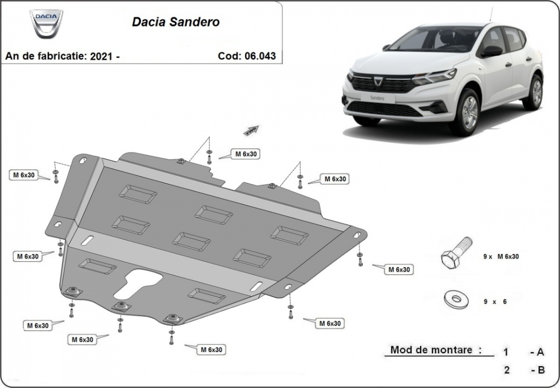 Der Unterfahrschutz ist neu und passt perfekt für alle Dacia Sandero versionen, die zwischen 2021 und 2026 hergestellt wurden. Die Abschirmung schützt: motor, getriebe Aus Stahlblech angefertigt mit einer Stärke von 2 mm. Schrauben, Mutter, Klips - alle Befestigungszubehör sind im Lieferung enthalten. Um mehr Schutz zu bieten gegen Korrosion wird der Unterfahrschutz elektrostatisch besprüht (Pulverbeschichtet) und bei 200o eingebrannt bzw. getrocknet. |