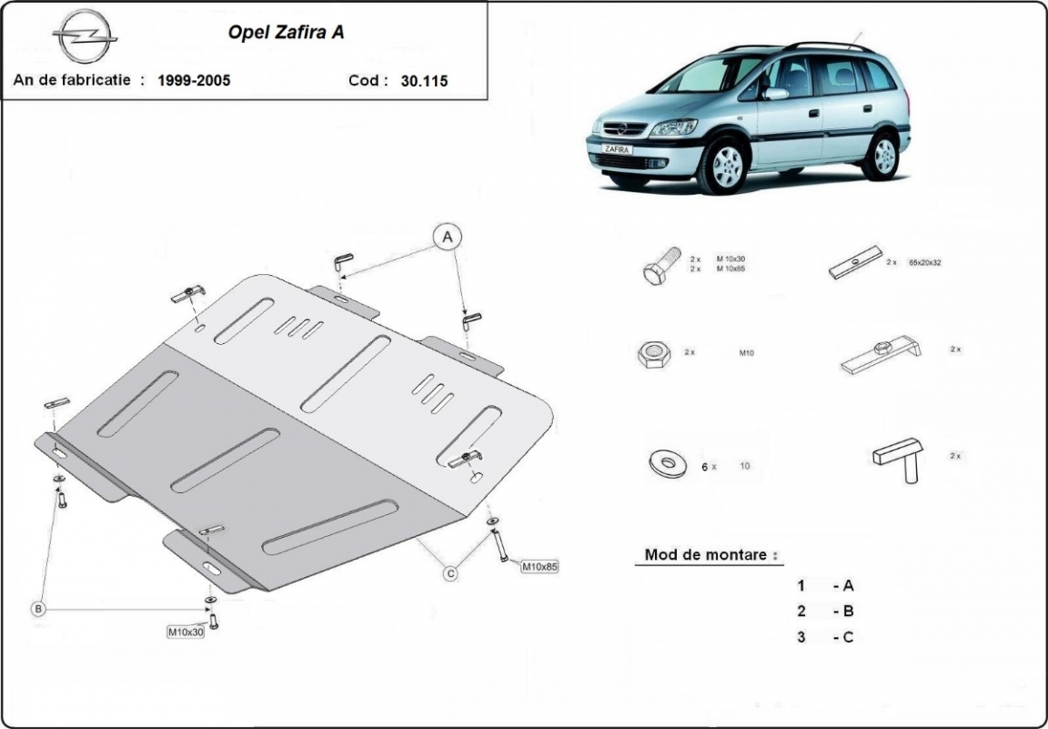 Der Unterfahrschutz ist neu und passt perfekt für alle Opel Zafira versionen, die zwischen 1999 und 2005 hergestellt wurden. Die Abschirmung schützt: motor, getriebe, kühler Aus Stahlblech angefertigt mit einer Stärke von 2 mm. Schrauben, Mutter, Klips - alle Befestigungszubehör sind im Lieferung enthalten. Um mehr Schutz zu bieten gegen Korrosion wird der Unterfahrschutz elektrostatisch besprüht (Pulverbeschichtet) und bei 200o eingebrannt bzw. getrocknet. |