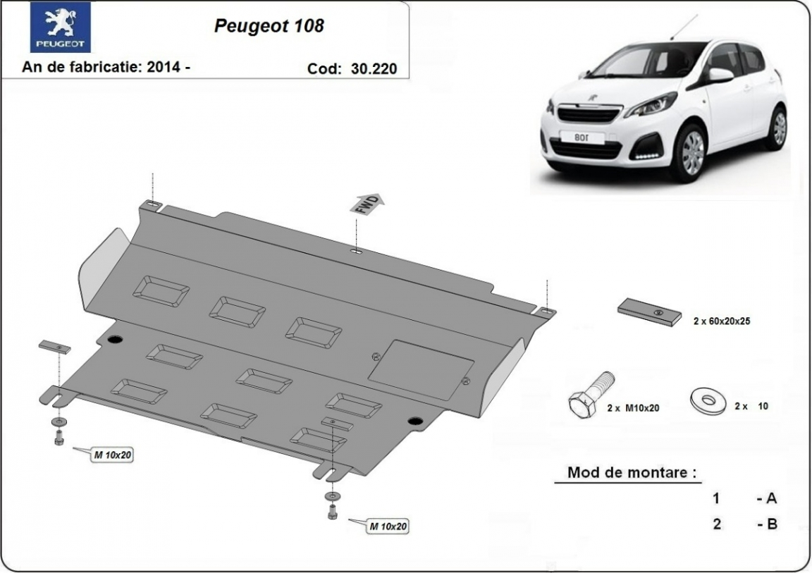 Der Unterfahrschutz ist neu und passt perfekt für alle Peugeot 108 versionen, die zwischen 2014 und 2021 hergestellt wurden. Die Abschirmung schützt: motor, getriebe, kühler Aus Stahlblech angefertigt mit einer Stärke von 2 mm. Schrauben, Mutter, Klips - alle Befestigungszubehör sind im Lieferung enthalten. Um mehr Schutz zu bieten gegen Korrosion wird der Unterfahrschutz elektrostatisch besprüht (Pulverbeschichtet) und bei 200o eingebrannt bzw. getrocknet. |