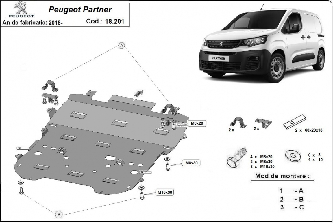Der Unterfahrschutz ist neu und passt perfekt für alle Peugeot Partner versionen, die zwischen 2018 und 2026 hergestellt wurden. Die Abschirmung schützt: motor, getriebe, kühler, vordere stossfänger Aus Stahlblech angefertigt mit einer Stärke von 2 mm. Schrauben, Mutter, Klips - alle Befestigungszubehör sind im Lieferung enthalten. Um mehr Schutz zu bieten gegen Korrosion wird der Unterfahrschutz elektrostatisch besprüht (Pulverbeschichtet) und bei 200o eingebrannt bzw. getrocknet. |