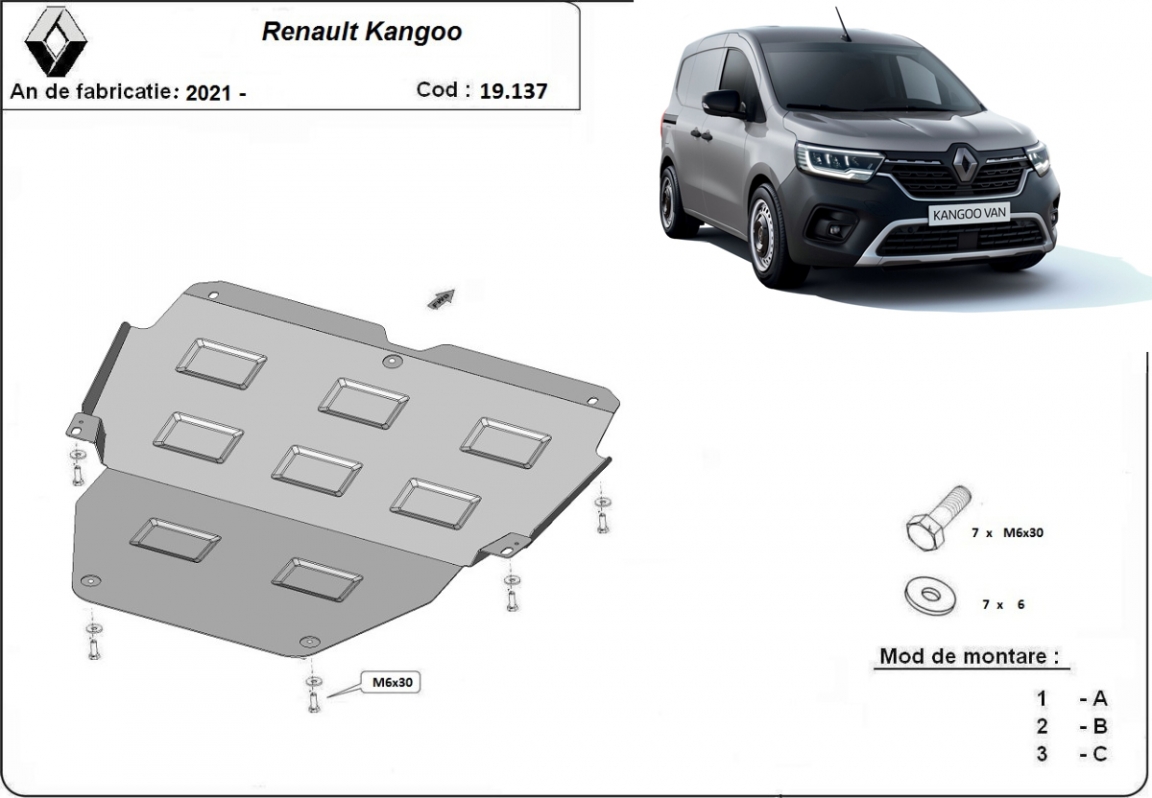 Der Unterfahrschutz ist neu und passt perfekt für alle Renault Kangoo versionen, die zwischen 2021 und 2026 hergestellt wurden. Die Abschirmung schützt: motor, getriebe Aus Stahlblech angefertigt mit einer Stärke von 2 mm. Schrauben, Mutter, Klips - alle Befestigungszubehör sind im Lieferung enthalten. Um mehr Schutz zu bieten gegen Korrosion wird der Unterfahrschutz elektrostatisch besprüht (Pulverbeschichtet) und bei 200o eingebrannt bzw. getrocknet. |