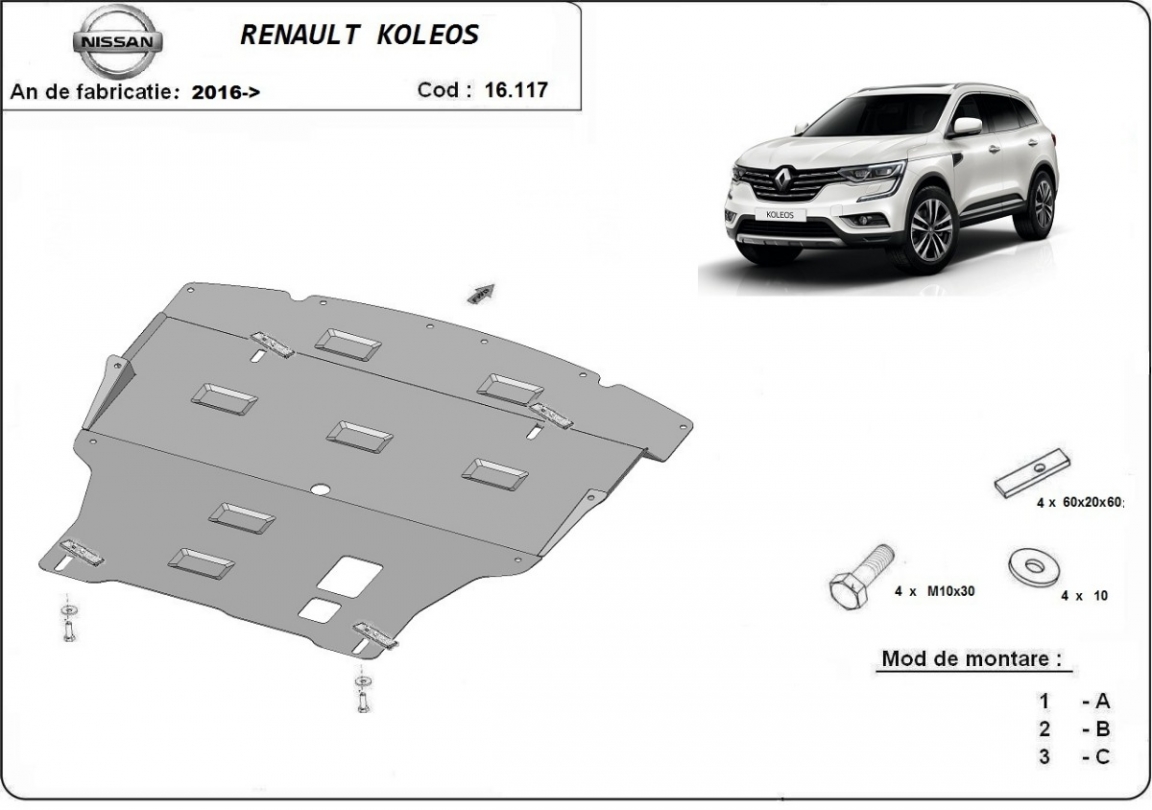 Der Unterfahrschutz ist neu und passt perfekt für alle Renault Koleos versionen, die zwischen 2016 und 2026 hergestellt wurden. Die Abschirmung schützt: motor, getriebe, kühler, vordere stossfänger Aus Stahlblech angefertigt mit einer Stärke von 2 mm. Schrauben, Mutter, Klips - alle Befestigungszubehör sind im Lieferung enthalten. Um mehr Schutz zu bieten gegen Korrosion wird der Unterfahrschutz elektrostatisch besprüht (Pulverbeschichtet) und bei 200o eingebrannt bzw. getrocknet. |
