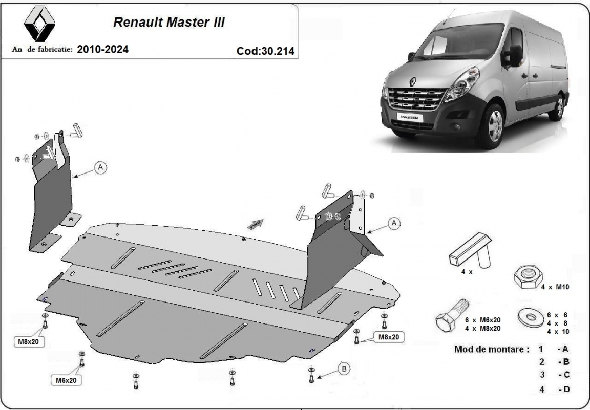 Der Unterfahrschutz ist neu und passt perfekt für alle Renault Master 3 versionen, die zwischen 2010 und 2024 hergestellt wurden. Die Abschirmung schützt: motor, getriebe, kühler, vordere stossfänger Aus Stahlblech angefertigt mit einer Stärke von 2 mm. Schrauben, Mutter, Klips - alle Befestigungszubehör sind im Lieferung enthalten. Um mehr Schutz zu bieten gegen Korrosion wird der Unterfahrschutz elektrostatisch besprüht (Pulverbeschichtet) und bei 200o eingebrannt bzw. getrocknet. |