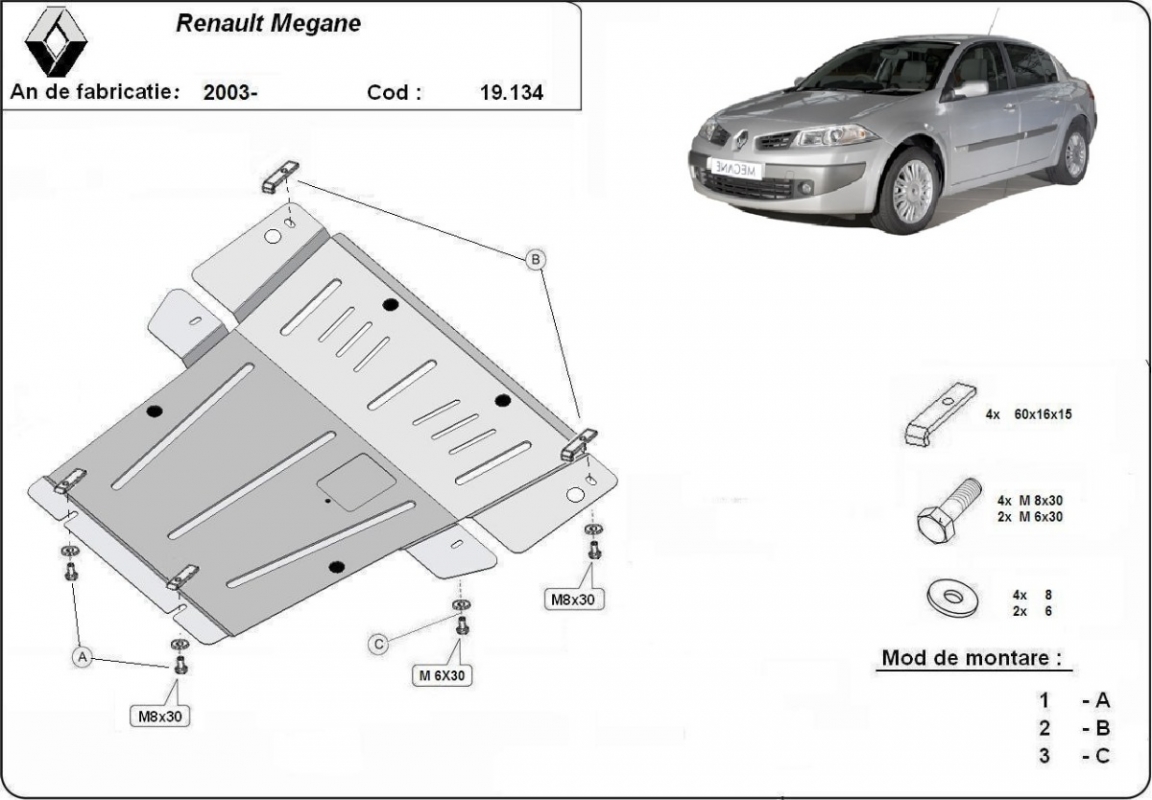 Der Unterfahrschutz ist neu und passt perfekt für alle Renault Megane 2 versionen, die zwischen 2004 und 2008 hergestellt wurden. Die Abschirmung schützt: motor, getriebe, kühler Befügt über ein Fensterchen zur Ölwanne, so dass dessen Entfernung beim Ölwechsel nicht notwendig sein wird. Aus Stahlblech angefertigt mit einer Stärke von 2 mm. Schrauben, Mutter, Klips - alle Befestigungszubehör sind im Lieferung enthalten. Um mehr Schutz zu bieten gegen Korrosion wird der Unterfahrschutz elektrostatisch besprüht (Pulverbeschichtet) und bei 200o eingebrannt bzw. getrocknet. |