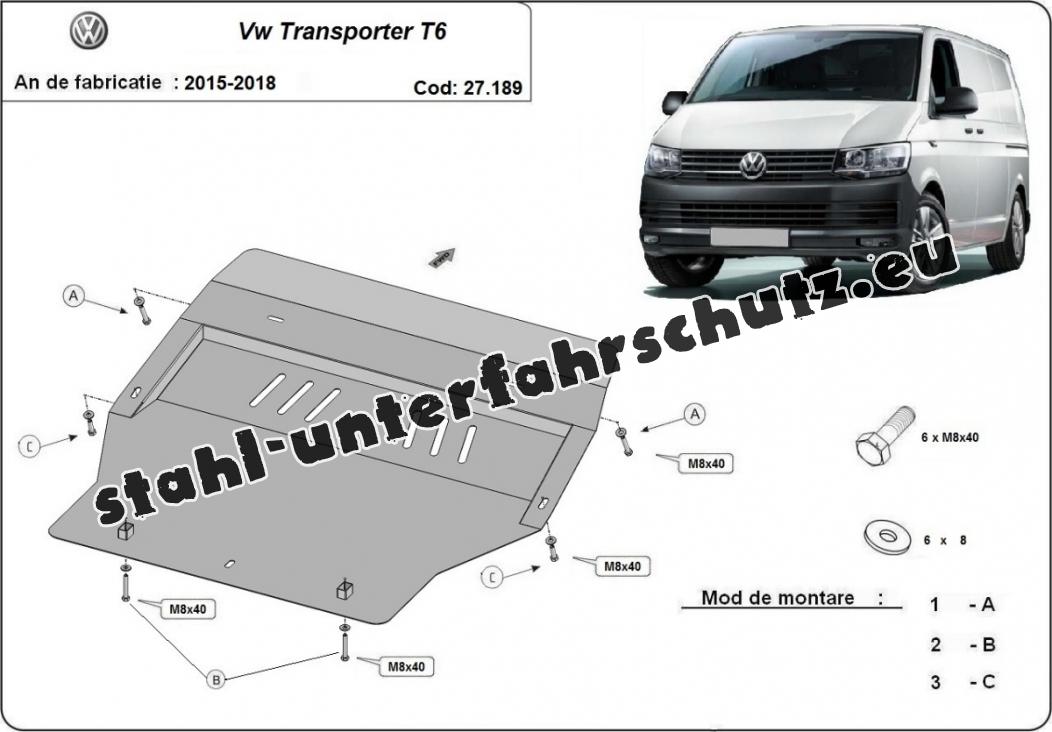 Der Unterfahrschutz ist neu und passt perfekt für alle Volkswagen Transporter T6 versionen, die zwischen 2015 und 2018 hergestellt wurden. Die Abschirmung schützt: motor, getriebe, kühler, vordere stossfänger Aus Stahlblech angefertigt mit einer Stärke von 2 mm. Schrauben, Mutter, Klips - alle Befestigungszubehör sind im Lieferung enthalten. Um mehr Schutz zu bieten gegen Korrosion wird der Unterfahrschutz elektrostatisch besprüht (Pulverbeschichtet) und bei 200o eingebrannt bzw. getrocknet. |