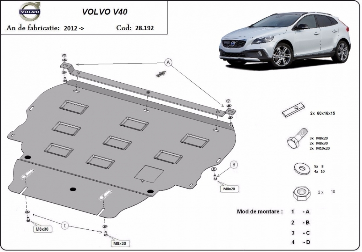 Der Unterfahrschutz ist neu und passt perfekt für alle Volvo V40 versionen, die zwischen 2012 und 2019 hergestellt wurden. Die Abschirmung schützt: motor, getriebe, kühler Befügt über ein Fensterchen zur Ölwanne, so dass dessen Entfernung beim Ölwechsel nicht notwendig sein wird. Aus Stahlblech angefertigt mit einer Stärke von 2 mm. Schrauben, Mutter, Klips - alle Befestigungszubehör sind im Lieferung enthalten. Um mehr Schutz zu bieten gegen Korrosion wird der Unterfahrschutz elektrostatisch besprüht (Pulverbeschichtet) und bei 200o eingebrannt bzw. getrocknet. |