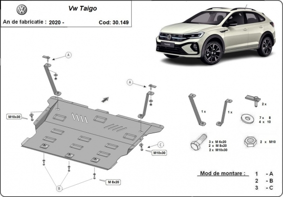 Der Unterfahrschutz ist neu und passt perfekt für alle VW Taigo versionen, die zwischen 2020 und 2026 hergestellt wurden. Die Abschirmung schützt: motor, getriebe, kühler, vordere stossfänger Aus Stahlblech angefertigt mit einer Stärke von 2 mm. Schrauben, Mutter, Klips - alle Befestigungszubehör sind im Lieferung enthalten. Um mehr Schutz zu bieten gegen Korrosion wird der Unterfahrschutz elektrostatisch besprüht (Pulverbeschichtet) und bei 200o eingebrannt bzw. getrocknet. |