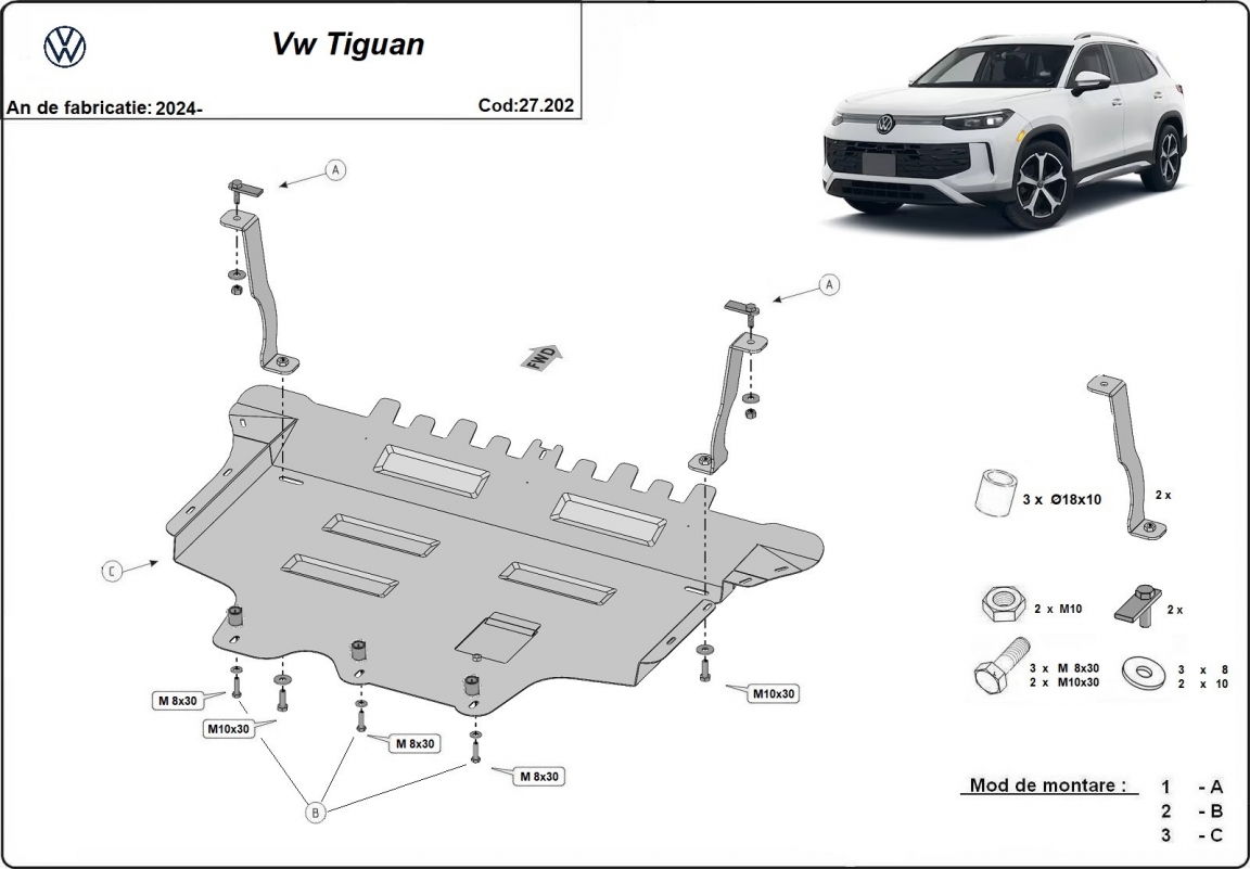 Der Unterfahrschutz ist neu und passt perfekt für den VW Tiguan mit den folgenden Motor- / Antriebsversionen: non-hybrid - hergestellt zwischen 2024 und 2026. Die Abschirmung schützt: motor, getriebe, kühler Aus Stahlblech angefertigt mit einer Stärke von 2 mm. Schrauben, Mutter, Klips - alle Befestigungszubehör sind im Lieferung enthalten. Um mehr Schutz zu bieten gegen Korrosion wird der Unterfahrschutz elektrostatisch besprüht (Pulverbeschichtet) und bei 200o eingebrannt bzw. getrocknet. |
