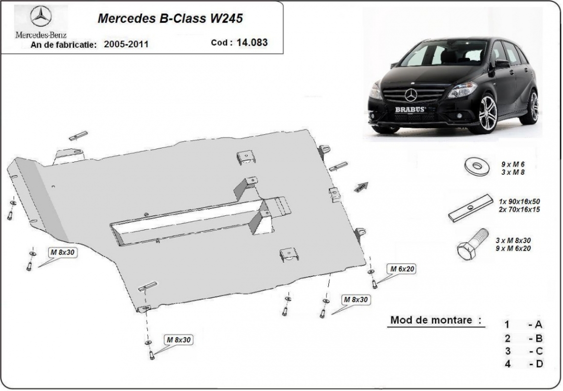 Der Unterfahrschutz ist neu und passt perfekt für alle Mercedes B-Class versionen, die zwischen 2005 und 2011 hergestellt wurden. Die Abschirmung schützt: motor, getriebe Aus Stahlblech angefertigt mit einer Stärke von 2 mm. Schrauben, Mutter, Klips - alle Befestigungszubehör sind im Lieferung enthalten. Um mehr Schutz zu bieten gegen Korrosion wird der Unterfahrschutz elektrostatisch besprüht (Pulverbeschichtet) und bei 200o eingebrannt bzw. getrocknet. |