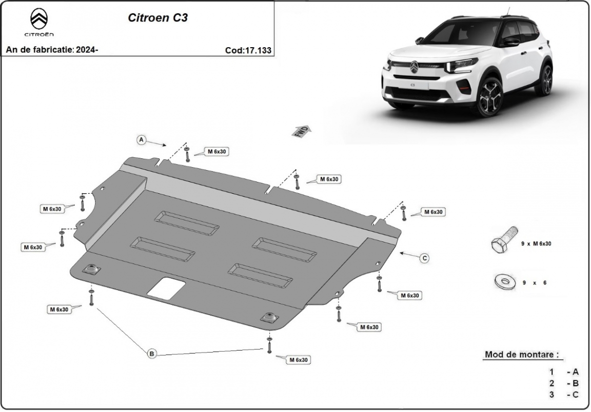 Der Unterfahrschutz ist neu und passt perfekt für alle Citroen C3 versionen, die zwischen 2024 und 2026 hergestellt wurden. Die Abschirmung schützt: motor, getriebe Aus Stahlblech angefertigt mit einer Stärke von 2 mm. Schrauben, Mutter, Klips - alle Befestigungszubehör sind im Lieferung enthalten. Um mehr Schutz zu bieten gegen Korrosion wird der Unterfahrschutz elektrostatisch besprüht (Pulverbeschichtet) und bei 200o eingebrannt bzw. getrocknet. |