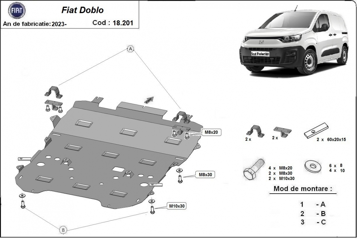 Der Unterfahrschutz ist neu und passt perfekt für alle Fiat Doblo versionen, die zwischen 2023 und 2026 hergestellt wurden. Die Abschirmung schützt: motor, getriebe, kühler, vordere stossfänger Aus Stahlblech angefertigt mit einer Stärke von 2 mm. Schrauben, Mutter, Klips - alle Befestigungszubehör sind im Lieferung enthalten. Um mehr Schutz zu bieten gegen Korrosion wird der Unterfahrschutz elektrostatisch besprüht (Pulverbeschichtet) und bei 200o eingebrannt bzw. getrocknet. |