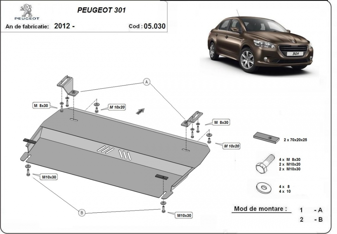 Der Unterfahrschutz ist neu und passt perfekt für alle Peugeot 301 versionen, die zwischen 2012 und 2026 hergestellt wurden. Die Abschirmung schützt: motor, getriebe Aus Stahlblech angefertigt mit einer Stärke von 2 mm. Schrauben, Mutter, Klips - alle Befestigungszubehör sind im Lieferung enthalten. Um mehr Schutz zu bieten gegen Korrosion wird der Unterfahrschutz elektrostatisch besprüht (Pulverbeschichtet) und bei 200o eingebrannt bzw. getrocknet. |