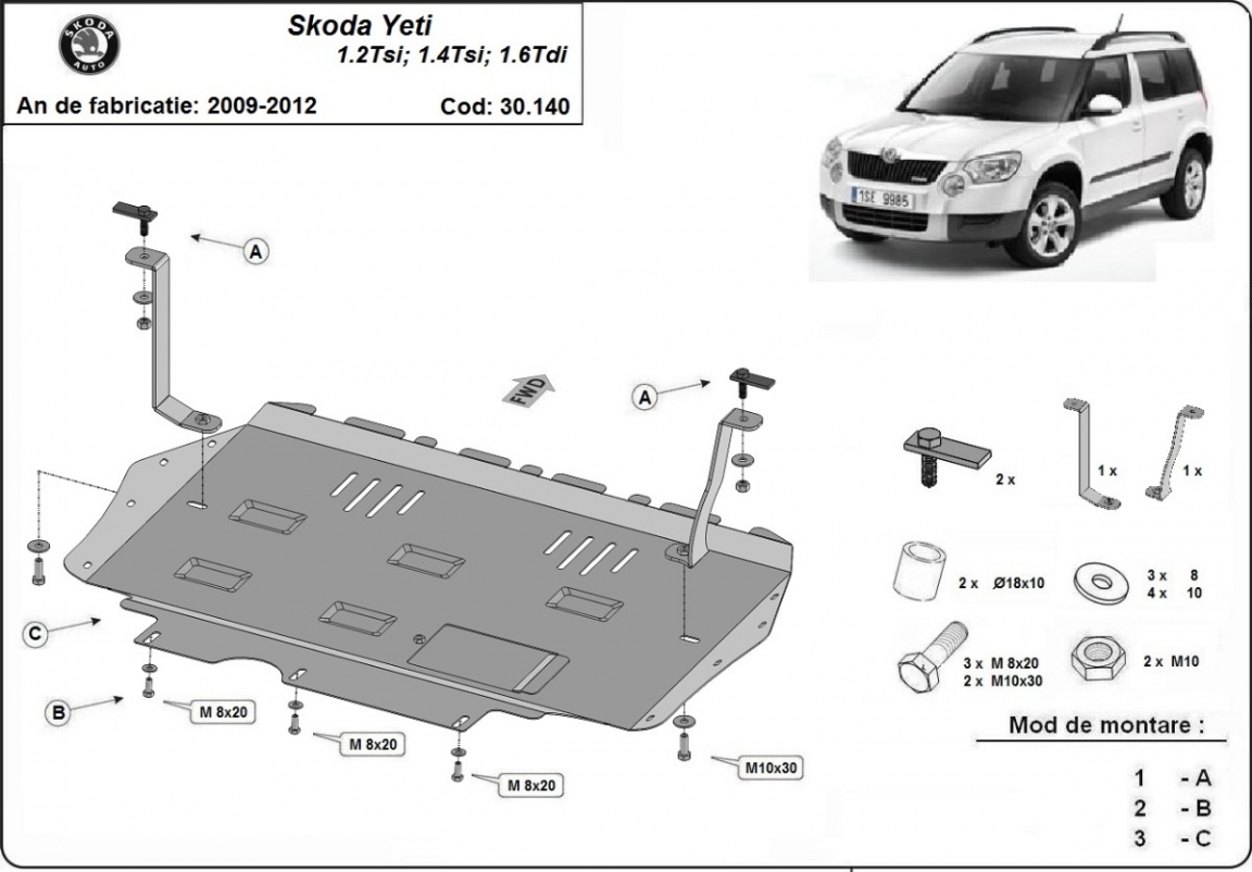 Der Unterfahrschutz ist neu und passt perfekt für den Skoda Yeti mit den folgenden Motor- / Antriebsversionen: 1.2,1.4,TSI, 1.8 , 1.6TDI, 2.0TDI,1.8TSI - hergestellt zwischen 2009 und 2012. Die Abschirmung schützt: motor, getriebe, kühler Befügt über ein Fensterchen zur Ölwanne, so dass dessen Entfernung beim Ölwechsel nicht notwendig sein wird. Aus Stahlblech angefertigt mit einer Stärke von 2 mm. Schrauben, Mutter, Klips - alle Befestigungszubehör sind im Lieferung enthalten. Um mehr Schutz zu bieten gegen Korrosion wird der Unterfahrschutz elektrostatisch besprüht (Pulverbeschichtet) und bei 200o eingebrannt bzw. getrocknet. |