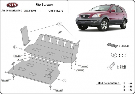 Pedí los dos cubrecarter para un Kia Sorento 2.5 crdi de 2003, uno para el motor compuesto de dos piezas, y otro para caja de cambios. El del motor se compone de dos piezas, y una de ellas está mal diseñada, queda unos 5 centímetros más baja que la original, la otra pieza sí encaja bien. Pero es que la pieza de la caja de cambios NO ENCAJA, no llega a los soportes del bastidor del coche. Por tanto, de 3 piezas sólo 1 es válida. No lo recomiendo por este motivo, una pena porque el material no es malo y están bien acabadas.